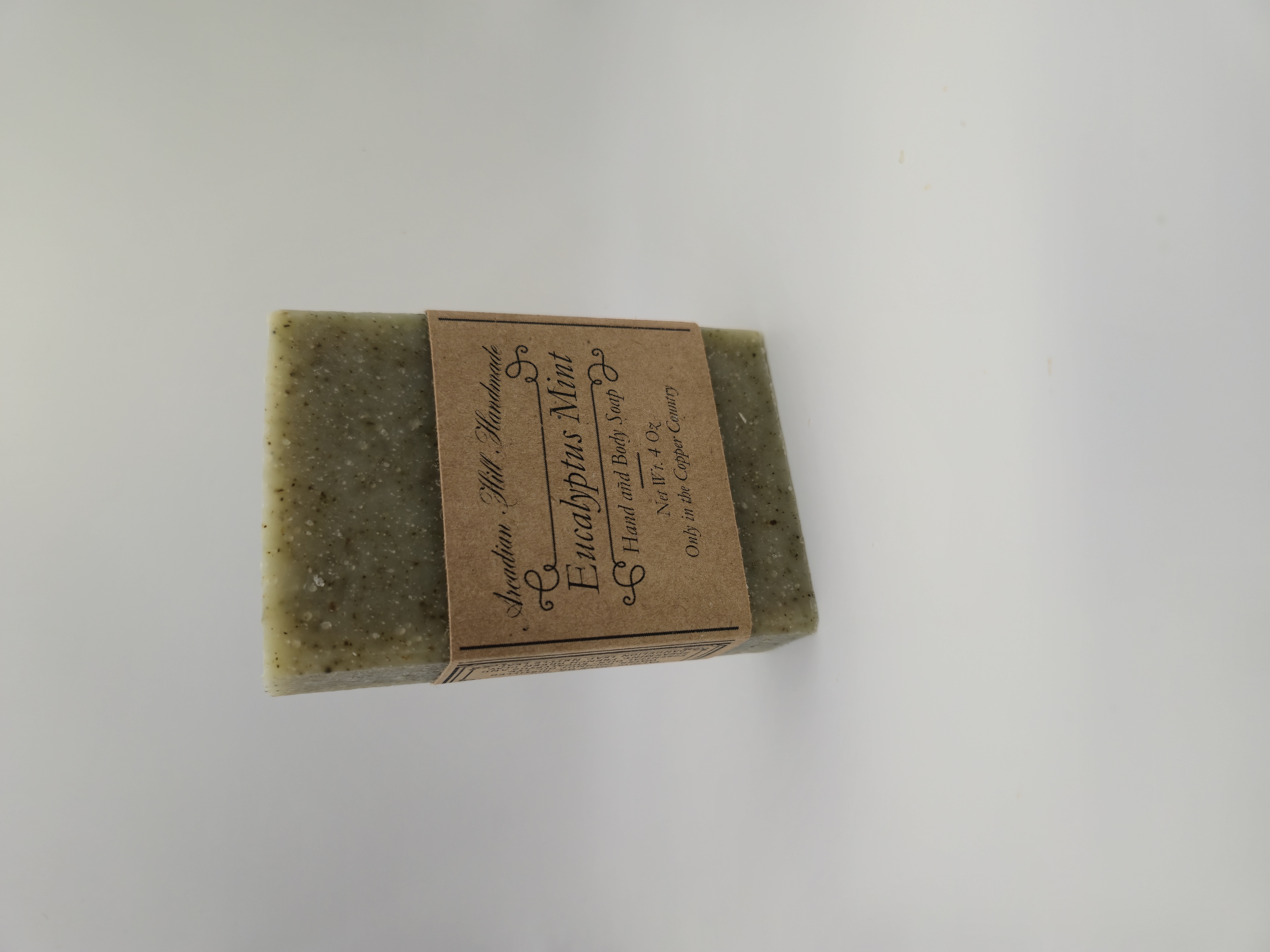 Just as simple and wonderful as it gets! No fancy swirl or swoopy top, but it sells out regularly because Eucalyptus Spearmint is a winning combination! Local Grass Fed/Finished Tallow is such a great skin care ingredient, and it makes this soap amazing! A hard, long-lasting bar with great lather. And good size, too. Closer to 5 oz than 4.